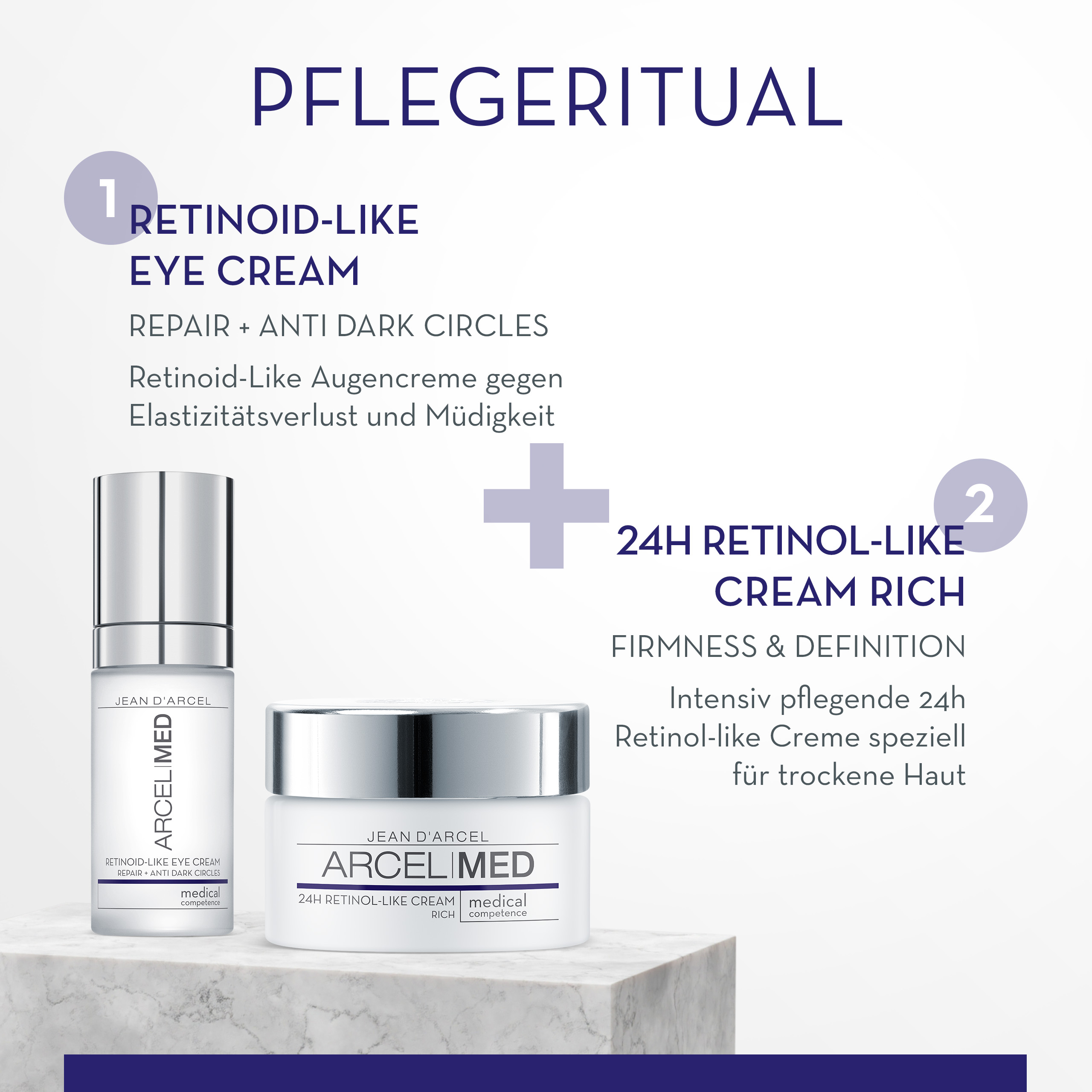 24H RETINOL-LIKE CREAM RICH je intenzivní anti-aging krém vyvinutý speciálně pro suchou pokožku. Jejich bohatá textura s peptidy a výživnými rostlinnými oleji snižuje vrásky, zlepšuje elasticitu pokožky a poskytuje výrazně hladší a pevnější vzhled pokožky. Ideální pro luxusní večerní péči, která pokožku hydratuje a regeneruje.