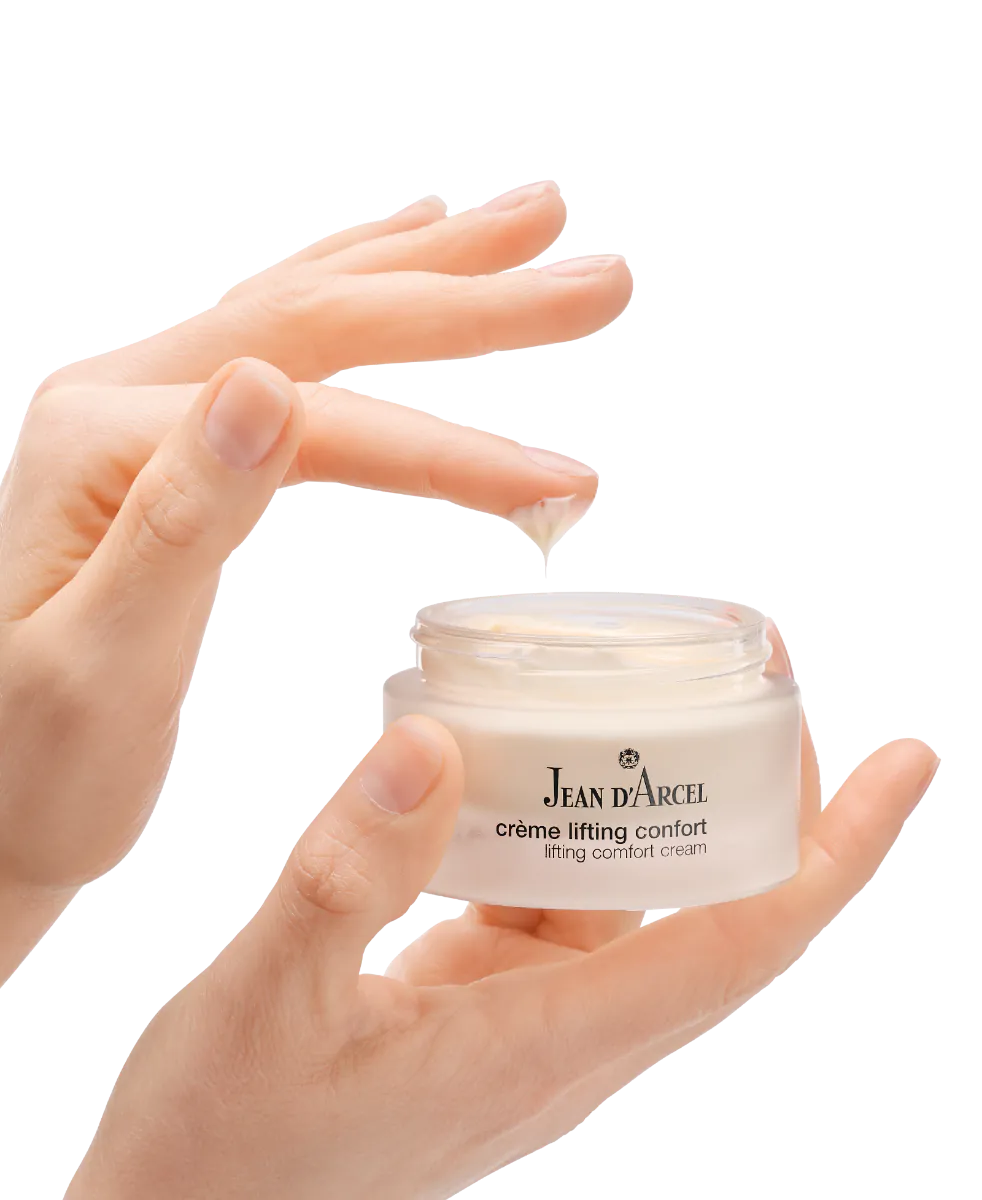 Créme lifting confort : Aqua [Water], Glycerin, Squalane, Macadamia Integrifolia Seed Oil, Persea Gratissima (Avocado) Oil, Simmondsia Chinensis (Jojoba) Seed Oil, Theobroma Grandiflorum Seed Butter, Cetearyl Isononanoate, Glyceryl Stearate Citrate, Propylheptyl Caprylate, Butylene Glycol, Panthenol, Cetearyl Alcohol, Lauryl Laurate, Caprylic/Capric Triglyceride, Glyceryl Stearate, Tocopheryl Acetate, Oenothera Biennis (Evening Primrose) Oil, Iris Florentina Root Extract, Spilanthes Acmella Flower Extract, Artemia Extract, Bisabolol, Pantolactone, Dimethicone, Glycine Soja (Soybean) Oil, Lecithin, Sodium Stearoyl Glutamate, Glyceryl Oleate, Polyacrylate Crosspolymer-6, Xanthan Gum, t-Butyl Alcohol, Sodium Chloride, Sodium Sulfate, Tetrasodium Glutamate Diacetate, Tocopherol, Ascorbyl Palmitate, Lactic Acid, Citric Acid, Sodium Hydroxide, Ethylhexylglycerin, Phenoxyethanol, Potassium Sorbate, Dehydroacetic Acid, Benzoic Acid, Limonene, Benzyl Alcohol, Parfum [Fragrance], CI 15985 [Yellow 6] Vers. 002