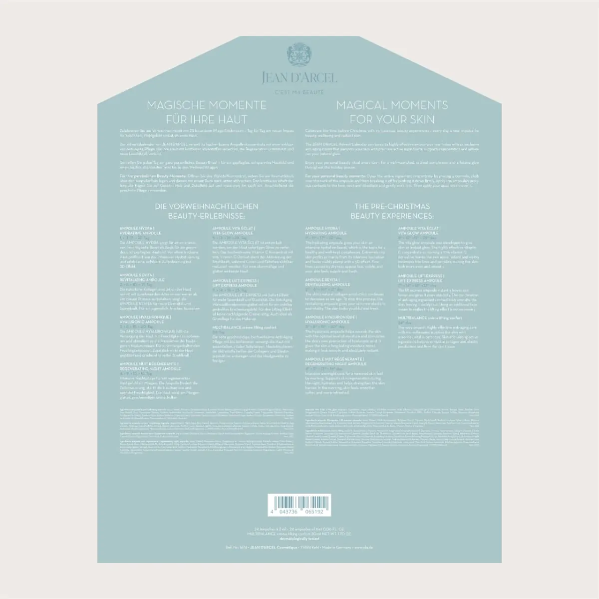 Adventní kalendář JEAN D’ARCEL kombinuje 24 vysoce účinných ampulových koncentrátů s exkluzivní péčí proti stárnutí, která hýčká vaši pokožku cennými účinnými látkami, podporuje regeneraci a dodává nový jas. Den za dnem exkluzivní okamžik pro dobře udržovanou pleť a zářivý vzhled až do Vánoc.